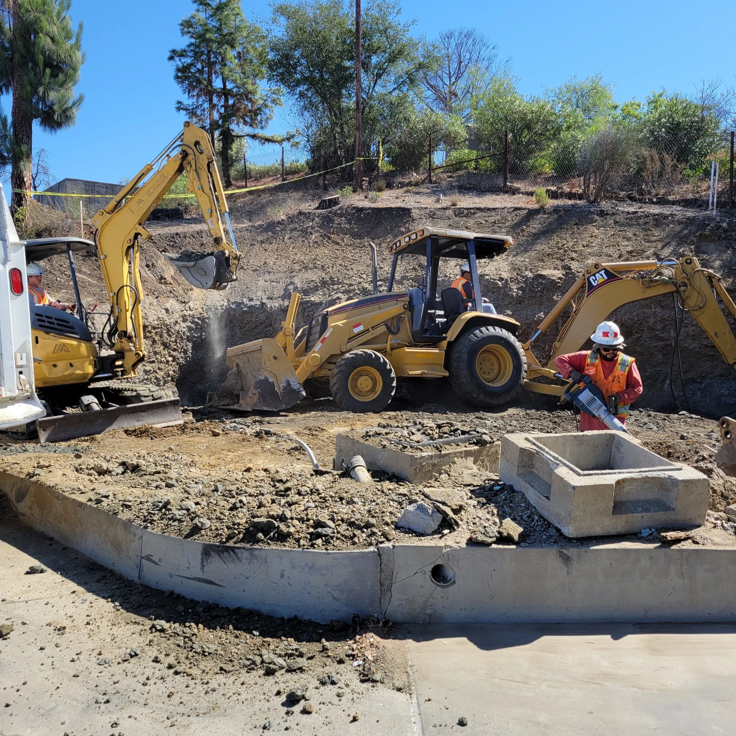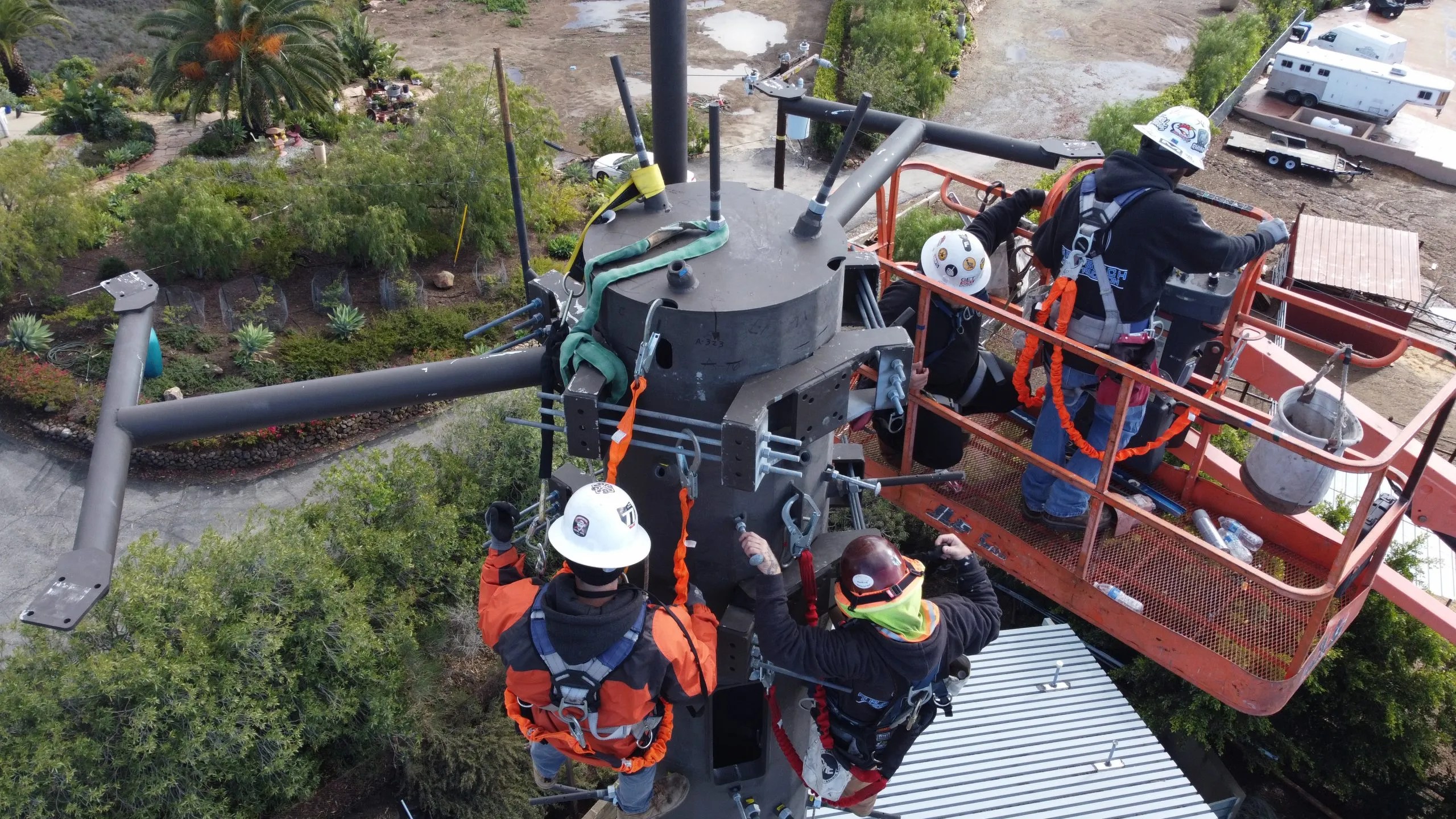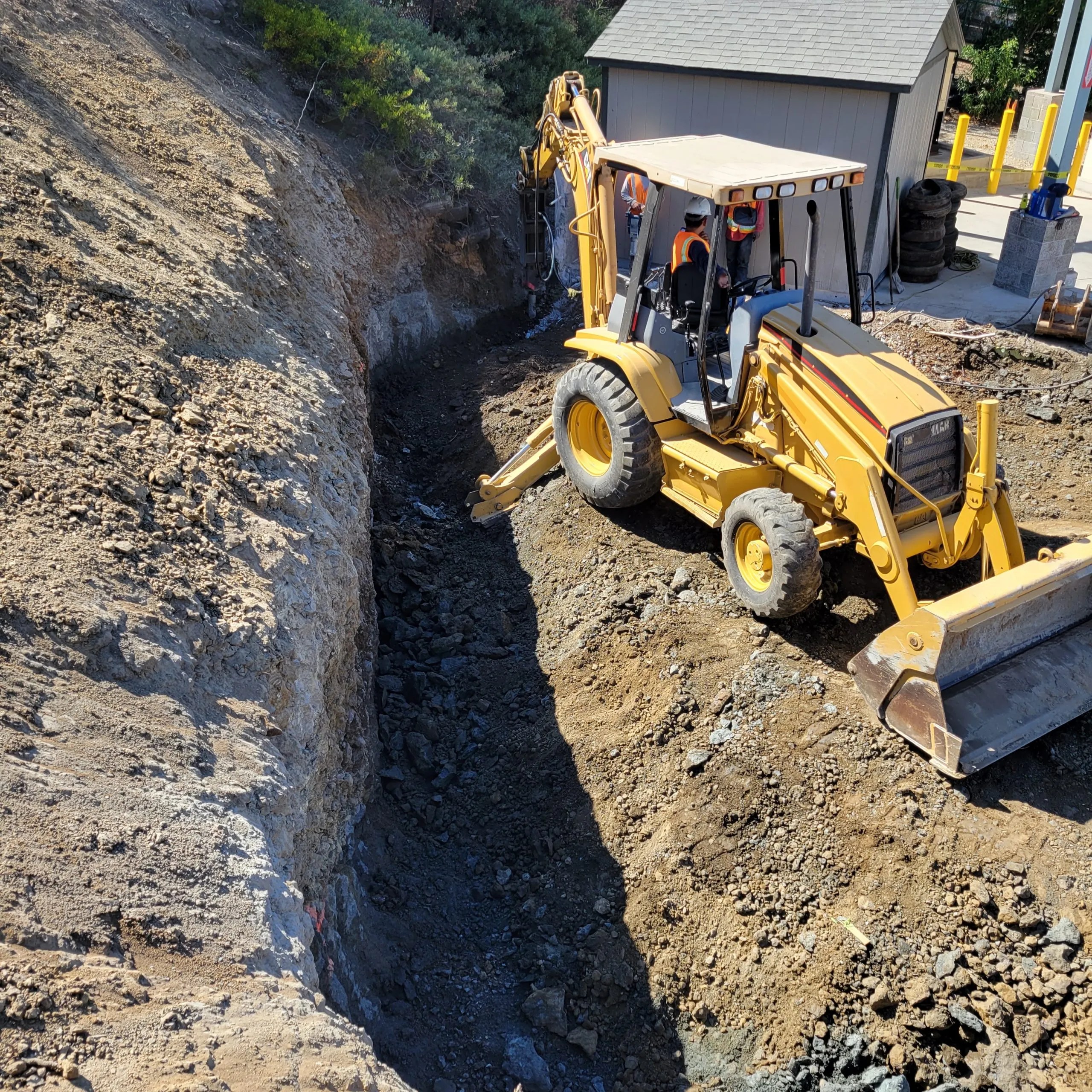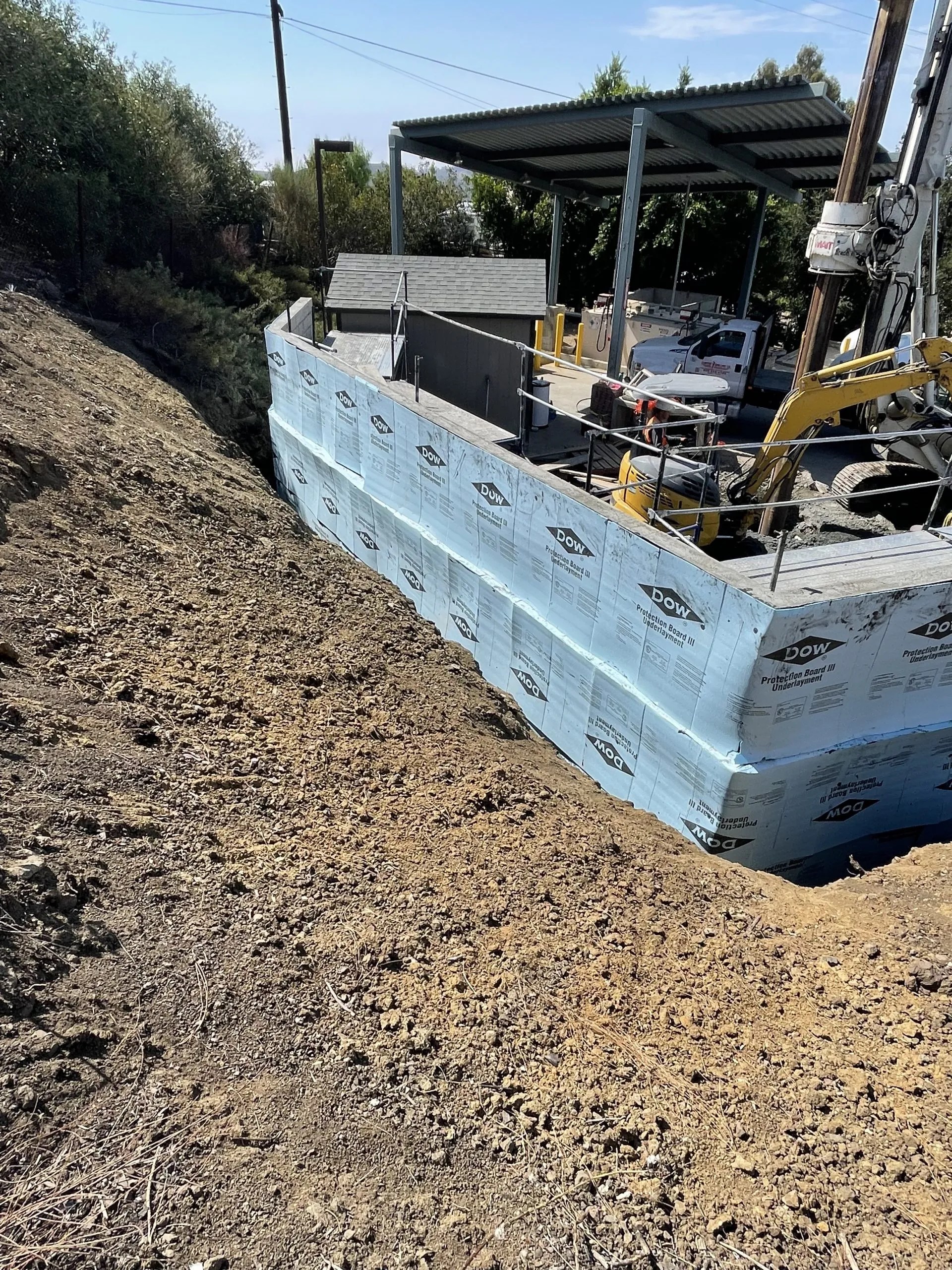 A new 70 ft tall MonoPine communications tower and prefabricated equipment shelter built into a very rocky hillside in the back of LA County Fire Station 72 in the hills above Malibu, this project challenging because it required us to cut into solid rock to accommodate the new facility and then drilling over a course of 6 weeks a hole at 8’ wide and 36 feet deep.